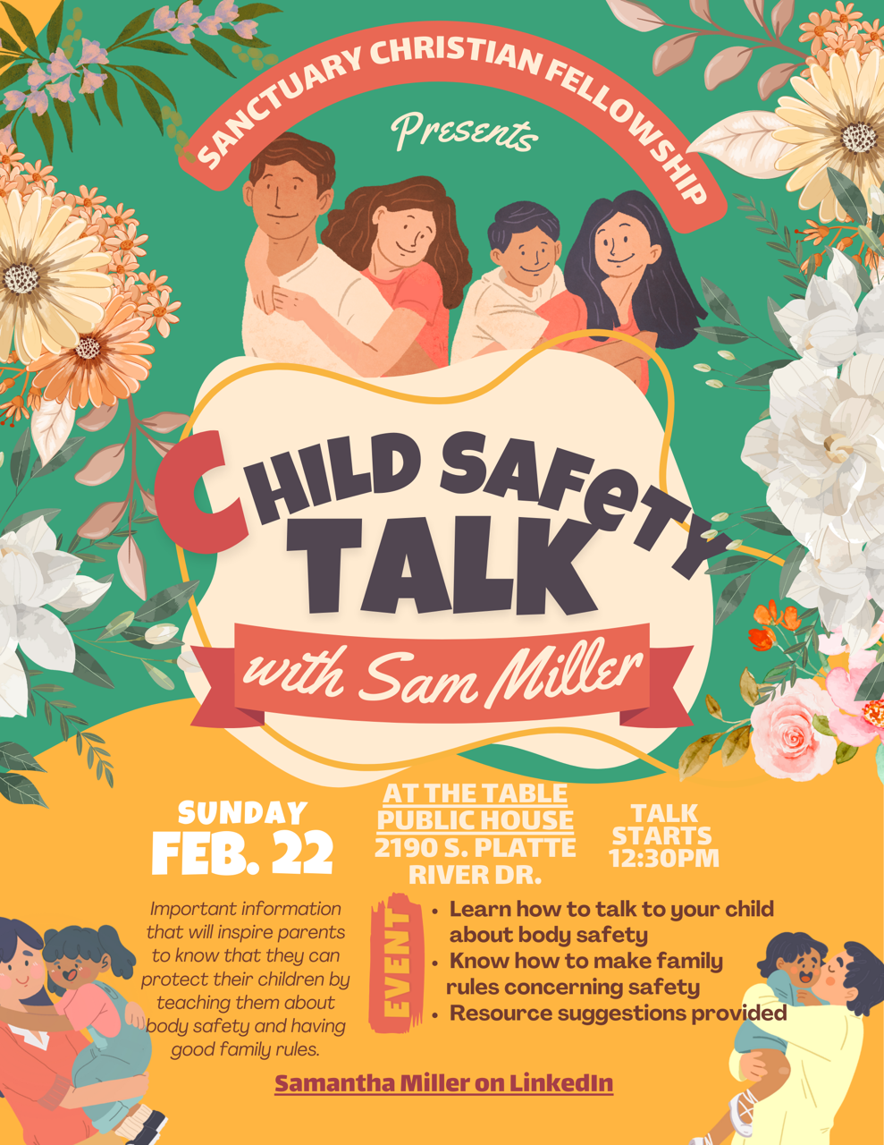 Global consultant with Voices Heard LLC, Samantha Miller will be giving this presentation on child safety. Please consider inviting parents, friends, neighbors, caregivers and grandparents! Food and drinks are available for purchase at The Table Public House. Dessert will be provided. Childcare will not be available but there is a kid's play area inside the public house. Contact Sanctuary's Children's Ministry Director, Katina Lowe with questions, info@scf.church.